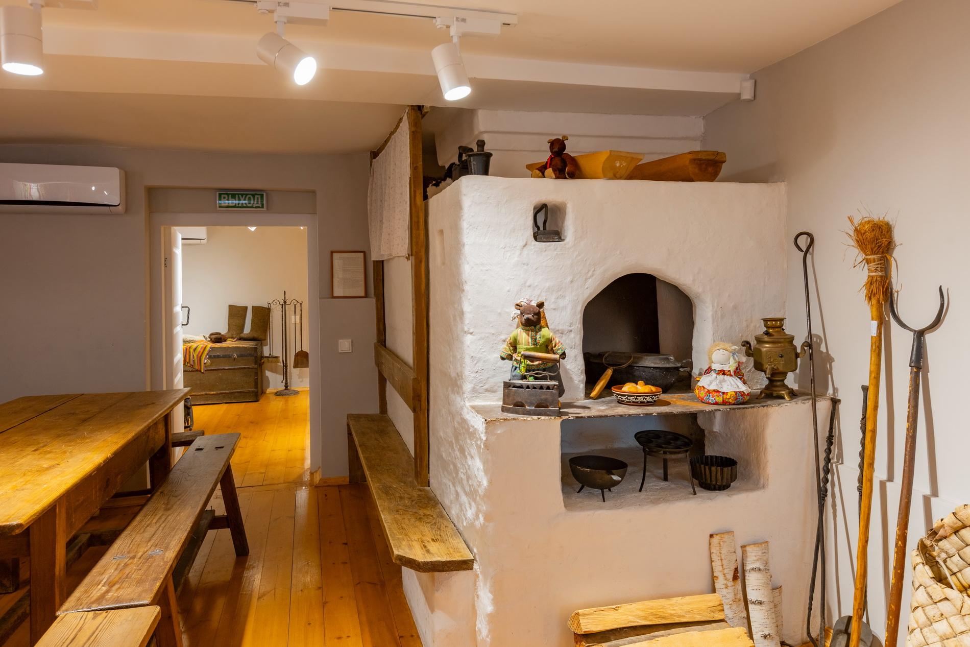 В печи есть углубления – «печурки» (в них нагревали утюги, сушили варежки); очаг, за затвором которого «под» (на него ставили пироги, хлеб – отсюда понятия «подовый хлеб», «подовый пирог»). На «шестке» стоит посуда (утятница, сковородки, формы для выпечки). Рядом с печью ухваты, помело, кочерга – предметы для того, чтобы доставать чугунки, разметать золу, мешать угли.