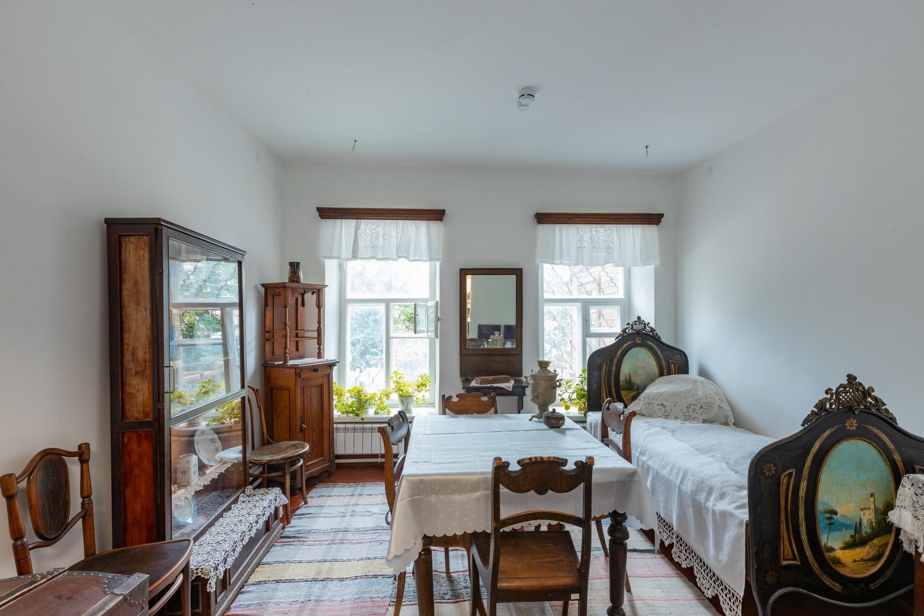 Все для жизни в этой уютной комнате: большое зеркало в деревянной раме, узорные занавески, блестящий самовар цилиндрической формы. Почтальон мог и отдохнуть с дороги, и выпить чаю вприкуску. Есть место для чаепития, есть и для сна: четверть комнаты занимает кровать, покрытая белоснежной кружевной накидкой, с подзорами.